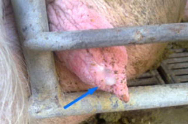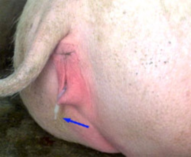 1.后備母豬出現(xiàn)鼻涕樣陰道排出物,無腐敗臭味。