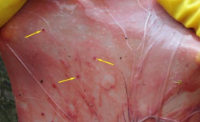 2.母豬返情率偏高,胎盤上會出現(xiàn)白斑或綠豆大小出血斑。