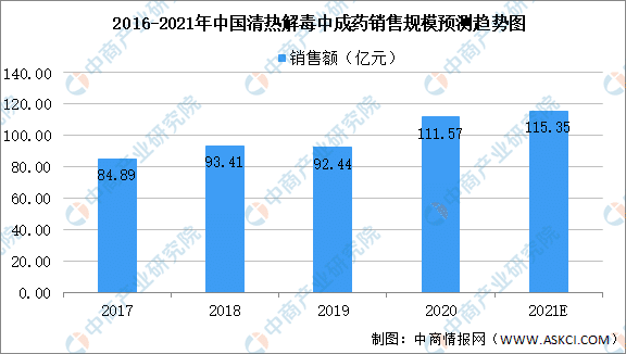 清熱解毒為中醫(yī)名詞,清熱解毒類藥物早己被臨床證實(shí)確有抗菌的功效,加之其毒副作用較小,被廣泛應(yīng)用于呼吸系統(tǒng)疾病及消化系統(tǒng)疾病的治療,在臨床使用中長(zhǎng)期占據(jù)著較為重要的地位。數(shù)據(jù)顯示,2019年中國(guó)城市零售藥店終端中成藥清熱解毒用藥銷售額超過92億元,同比下滑1.03%。預(yù)計(jì)2021年我國(guó)城市零售藥店終端中成藥清熱解毒用藥銷售額將達(dá)115.35億元。