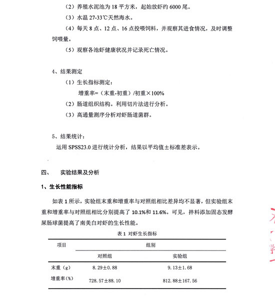 固態(tài)發(fā)酵屎腸球菌在南美白對(duì)蝦上的中試應(yīng)用結(jié)果