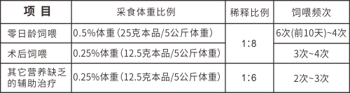 2、干法飼喂:按照上表采食體重百分比和飼喂頻次,稱(chēng)量適量奶粉,直接飼喂或拌在主糧一起飼喂。