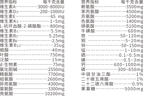 【原料組成 】12種必需氨基酸、中鏈脂肪酸(MCT)、Ω-3(亞麻酸+ EPA+ DHA)、乳酸鈣、膳食纖維、復合維生素、復合微量元素、果寡糖、雞肉粉和奶粉(載體)等。