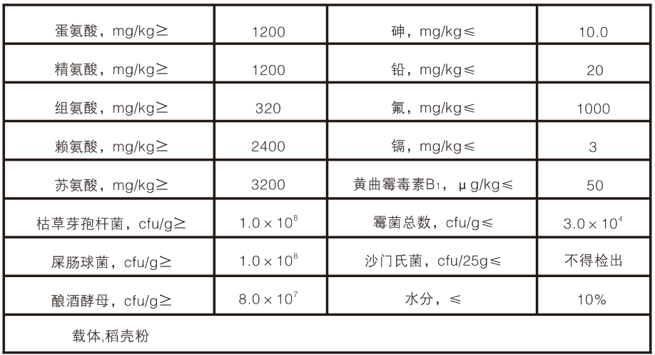 【原料組成】蛋氨酸、精氨酸、組氨酸、賴氨酸、蘇氨酸、枯草芽孢桿菌、屎腸球菌、釀酒酵母、載體稻殼粉。