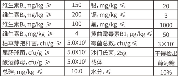 維生素B1、維生素B2、維生素B6、維生素B12、枯草芽孢桿菌、屎腸球菌、釀酒酵母,載體葡萄糖、奶粉等。